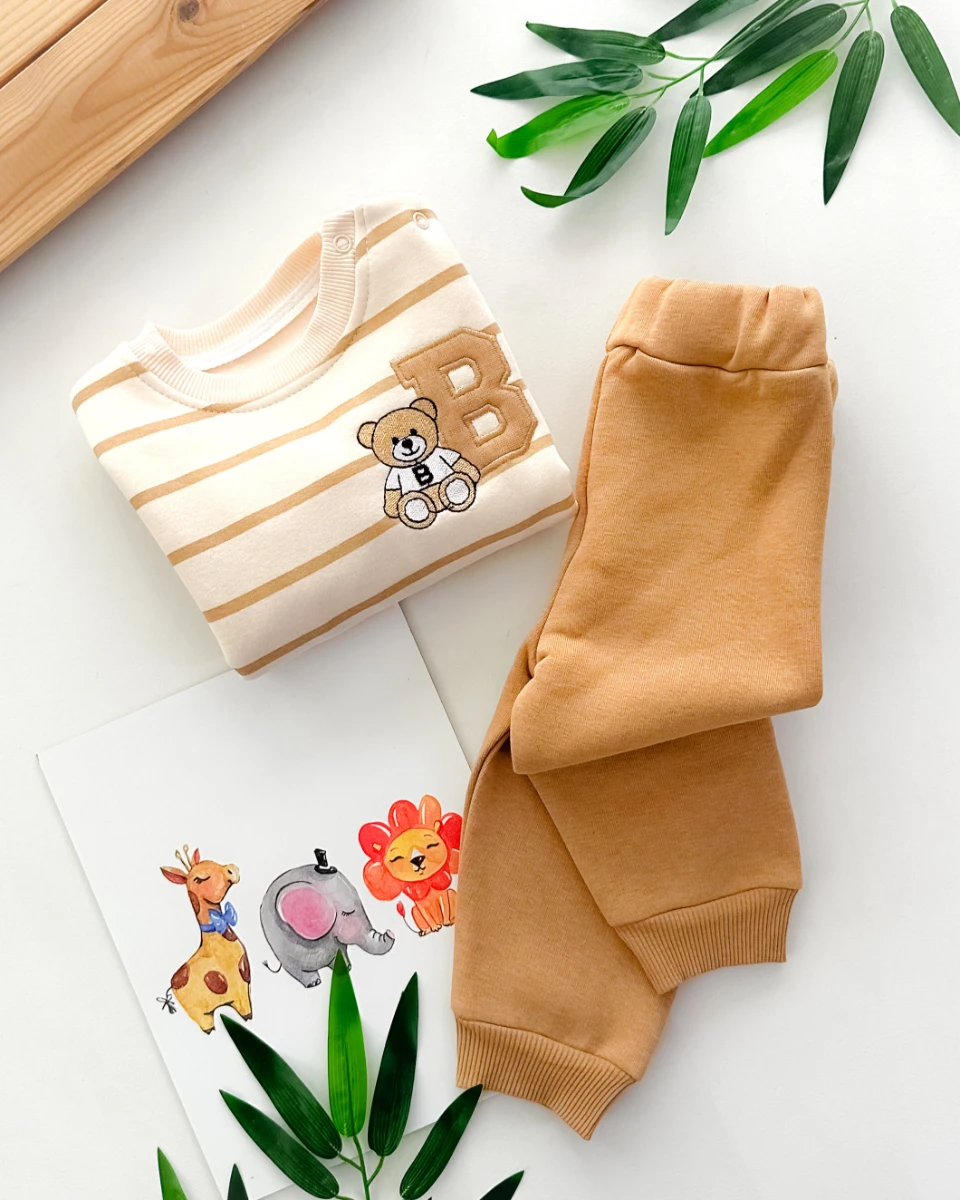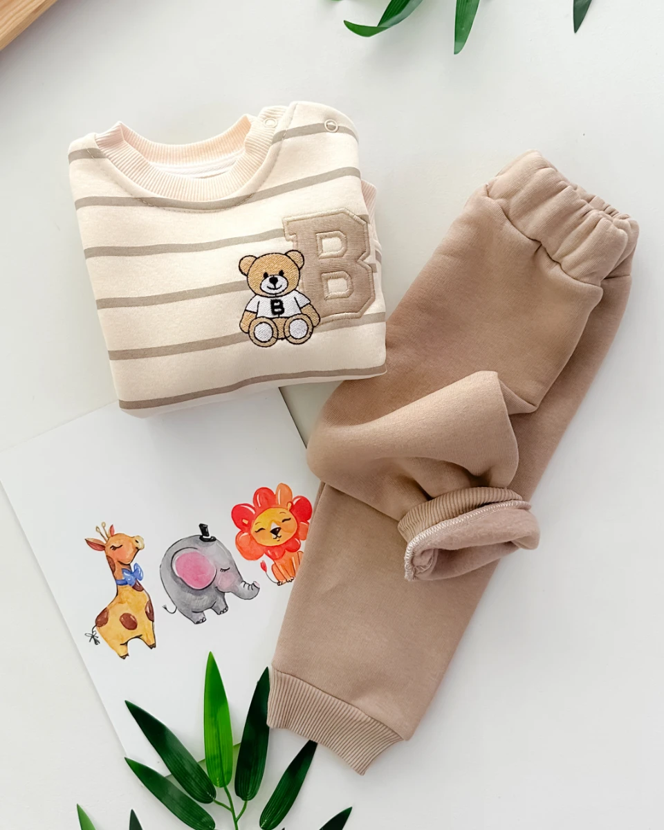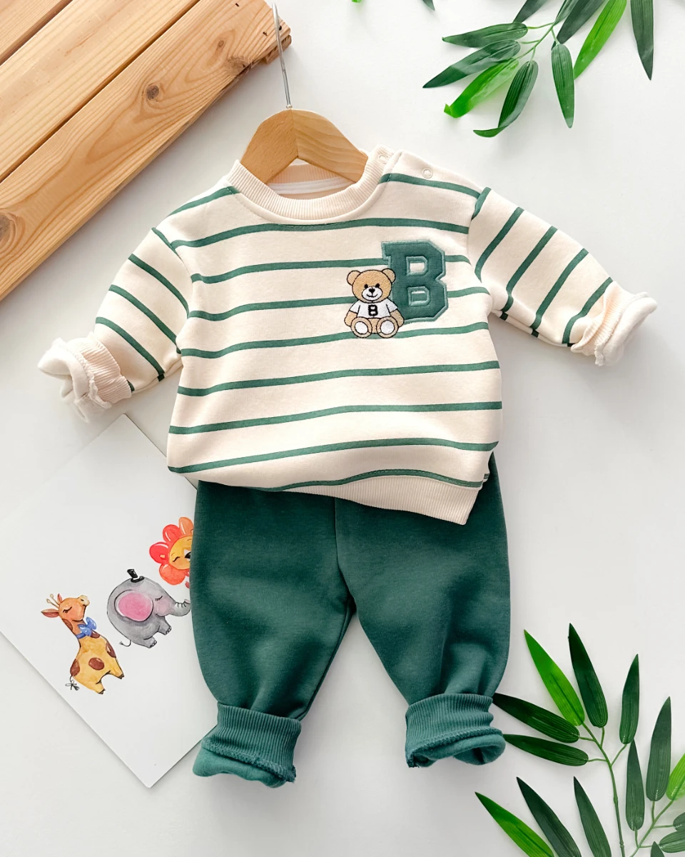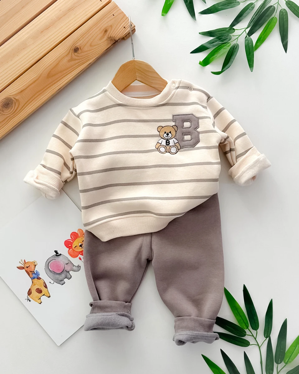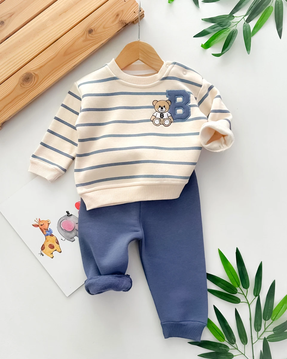 • B harfli ayıcık baskılı çizgi desenli omuzdan çıtçıtlı şardonlu 2 parça takım