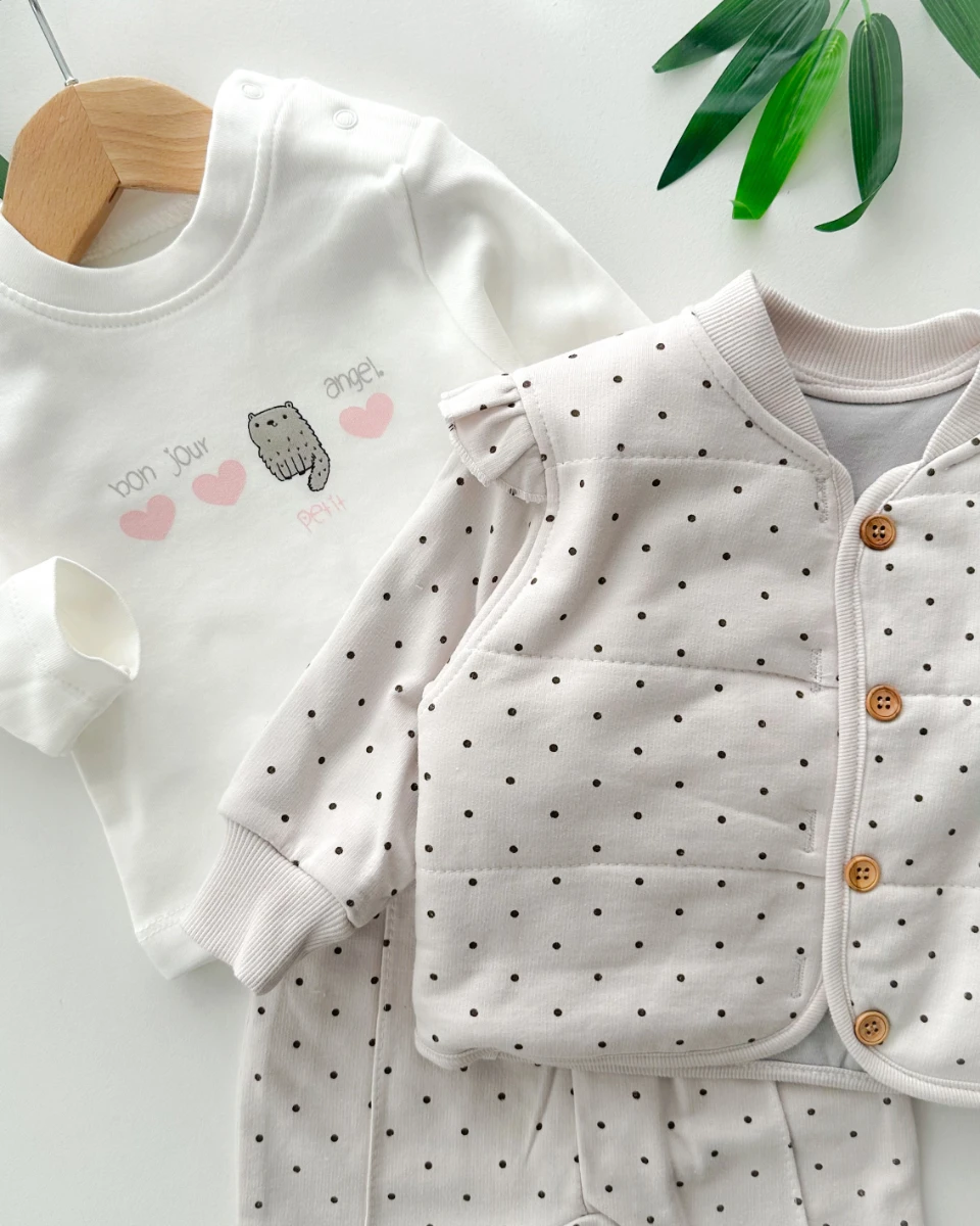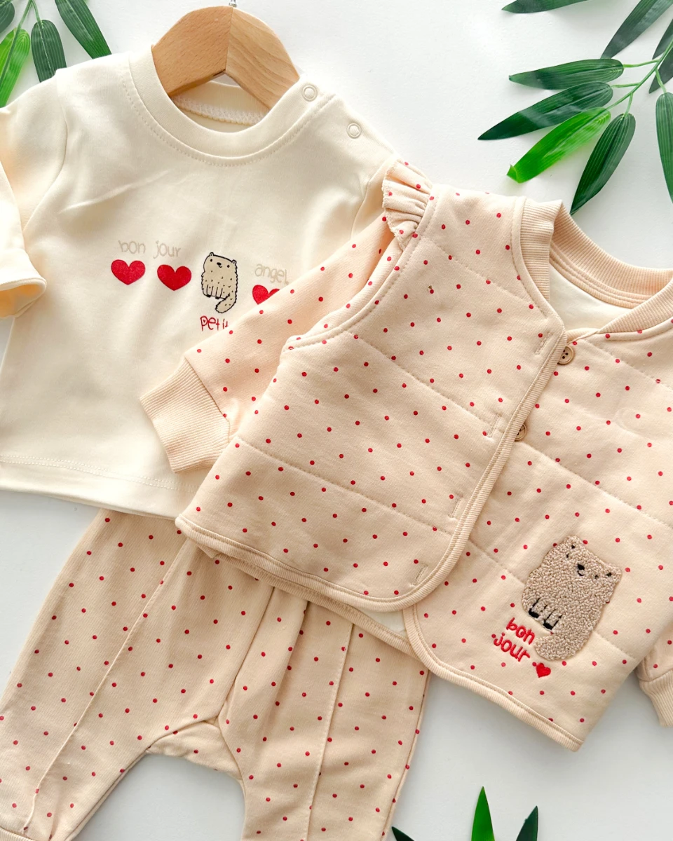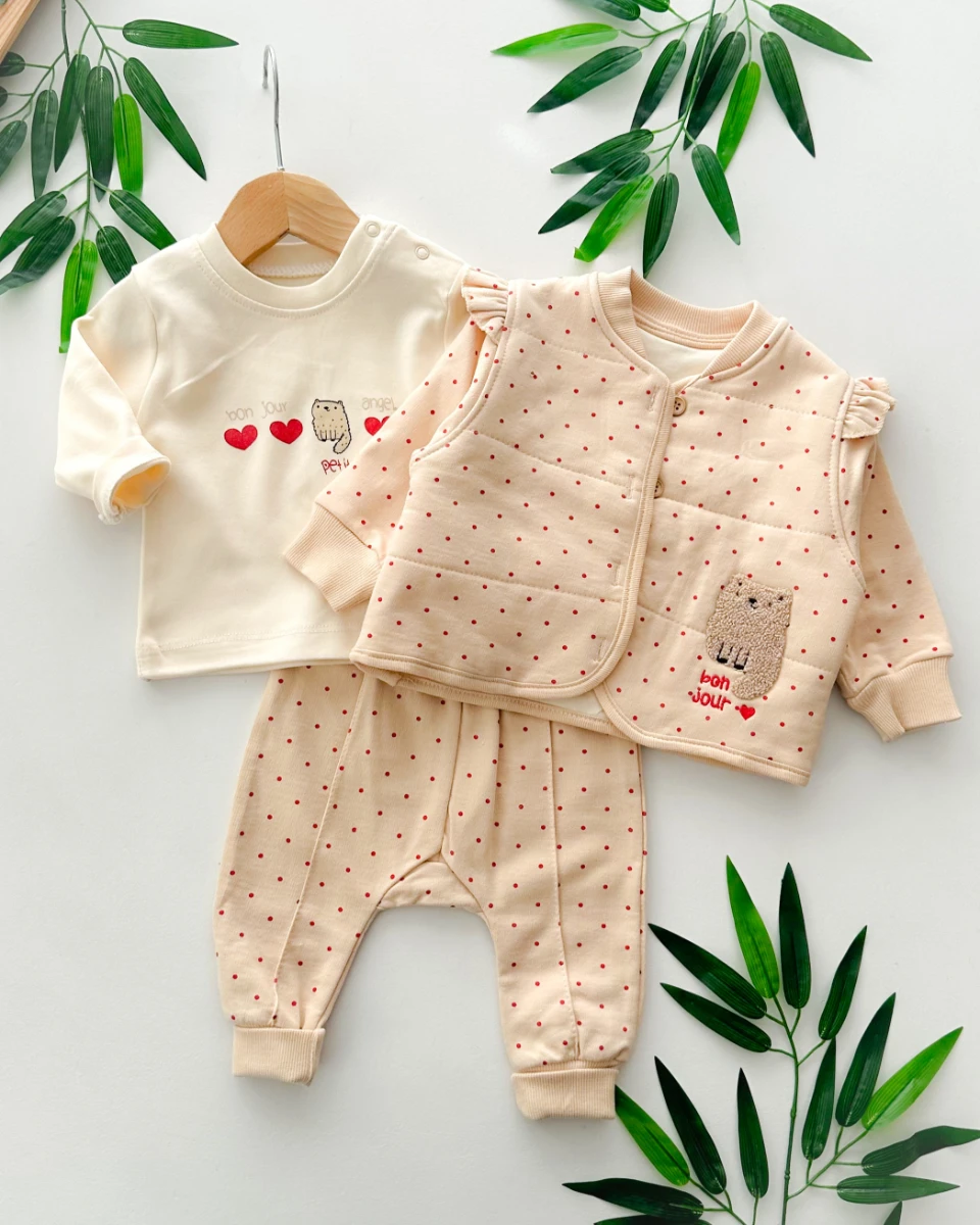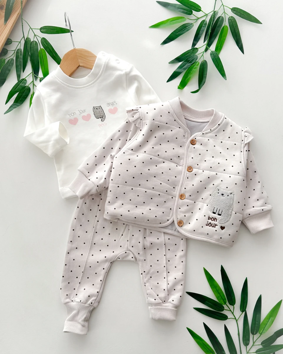 • Bonjour kedicik nakışlı puantiyeli ceketli 3 parça takım