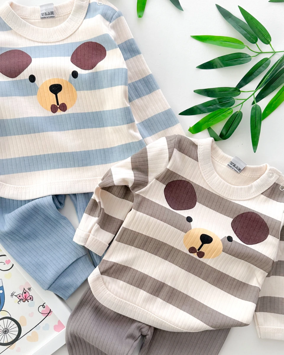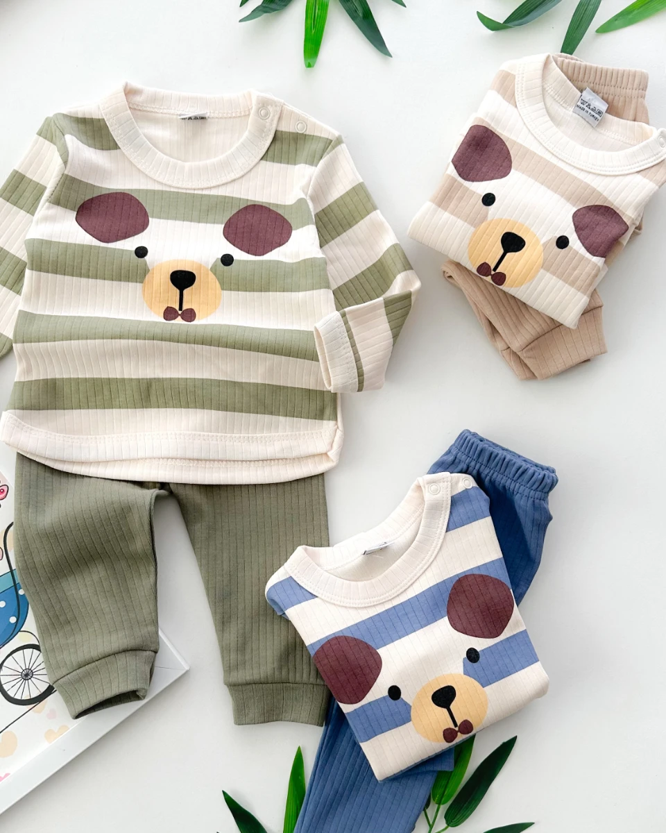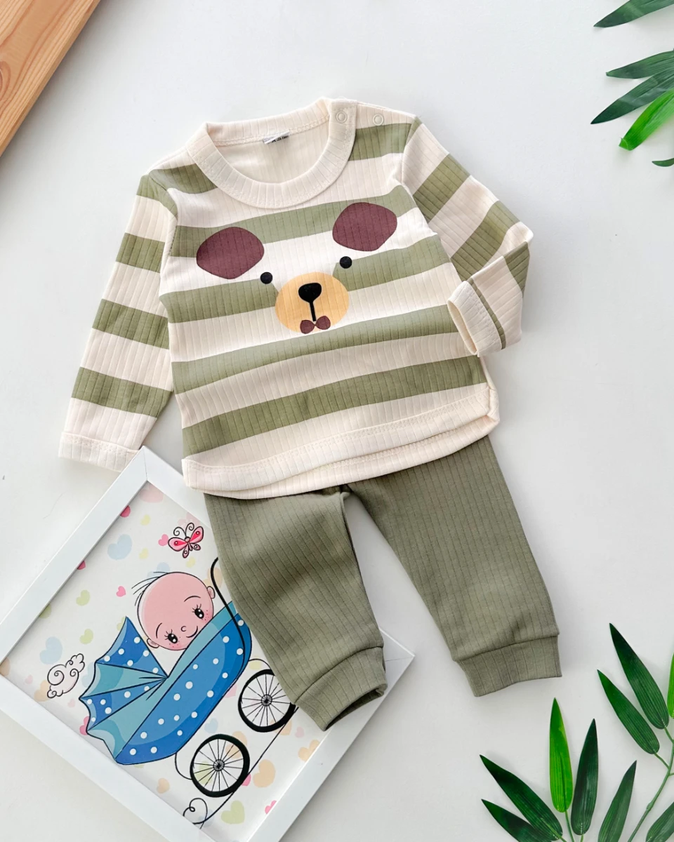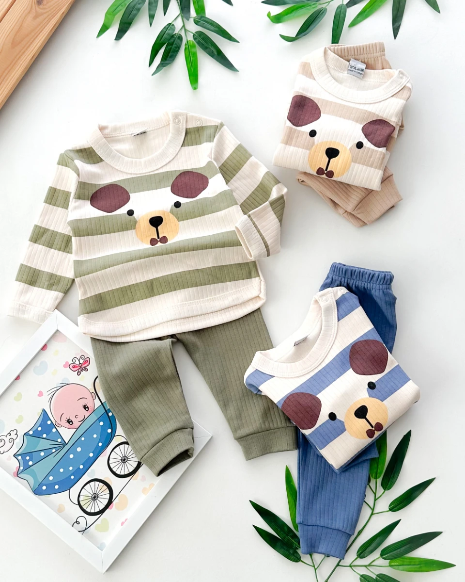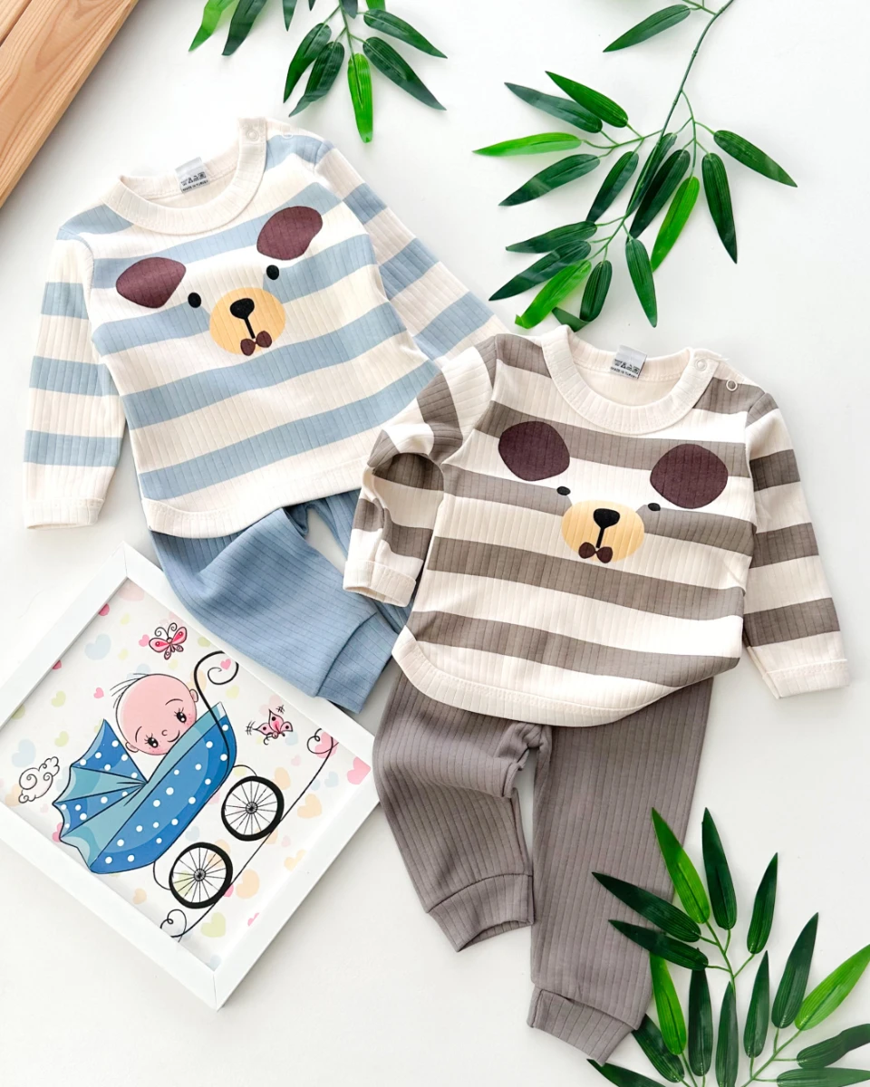 • Bordo kulak köpekçik baskılı çizgi desen fitilli kumaş mevsimlik 2 parça set