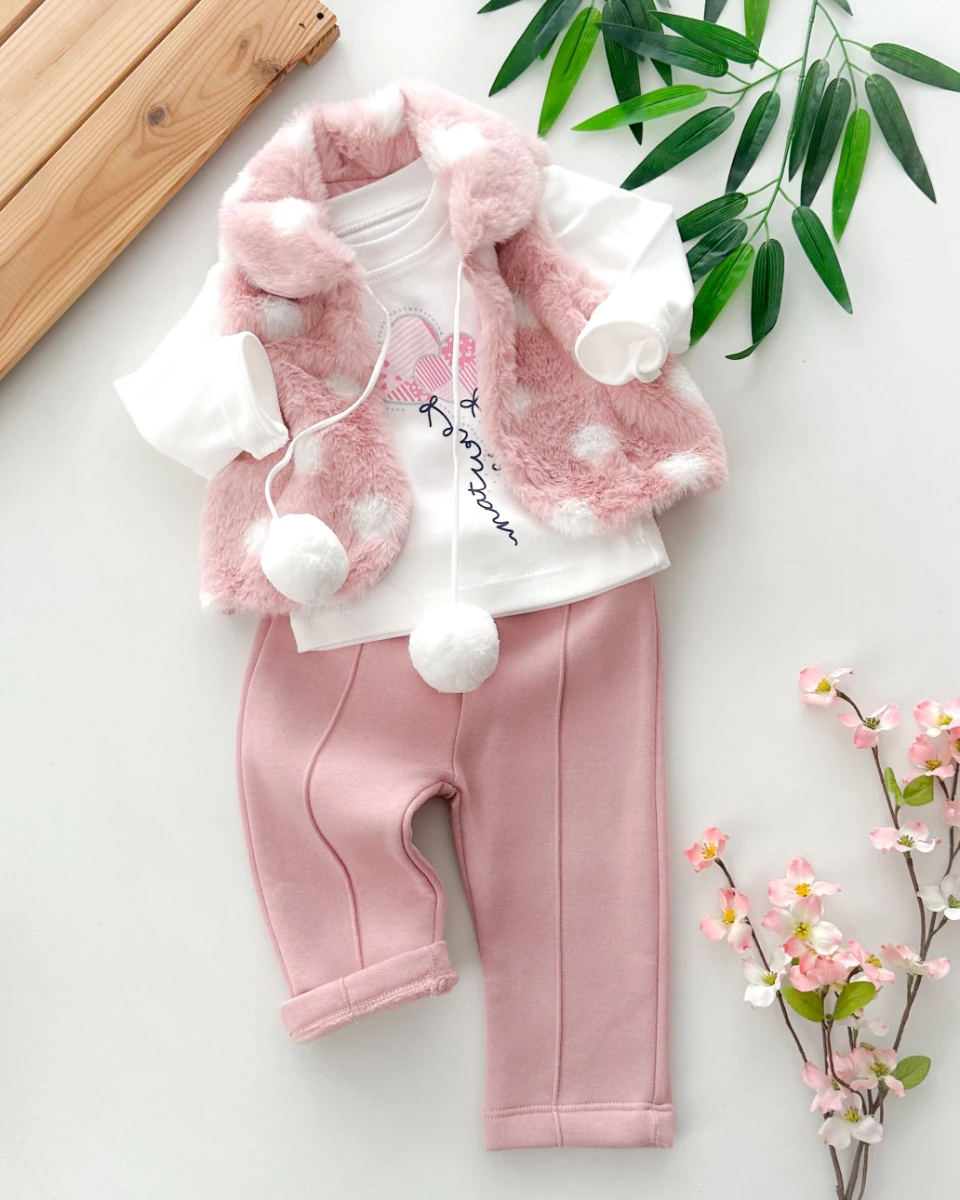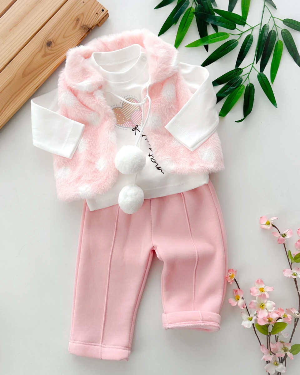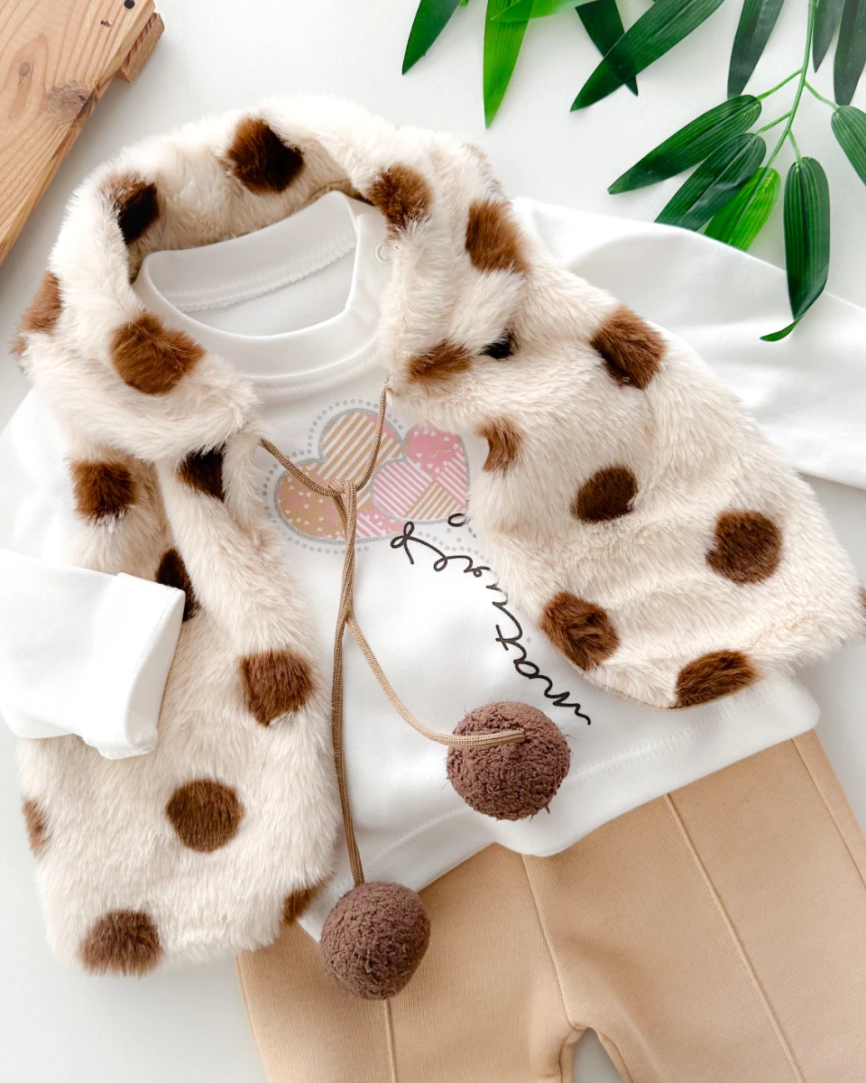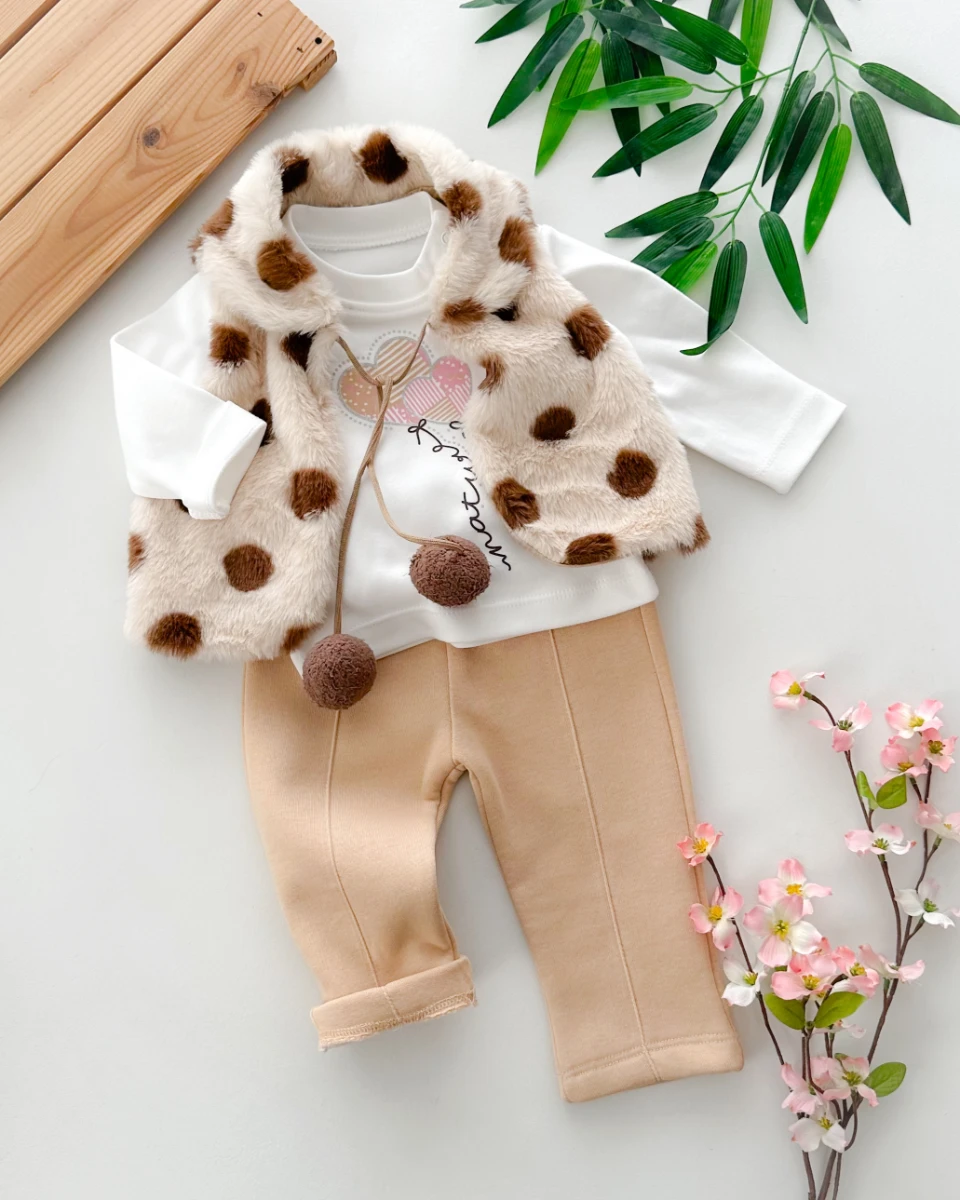 Büyük benekli tüylü yelekli ponpon ip baglamalı kışlık 3 parça takım