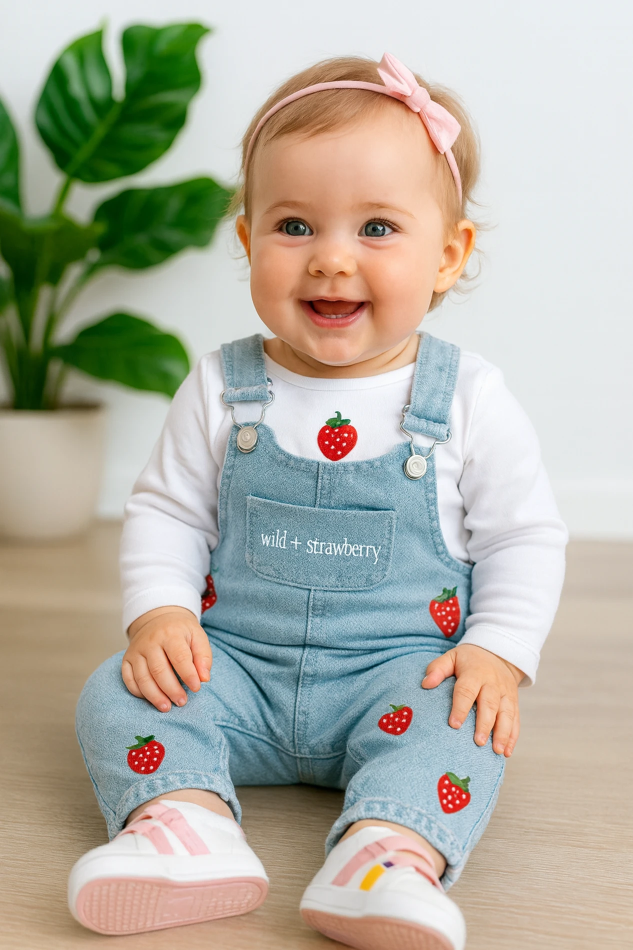 • Büyük çilekler nakışlı cep detaylı uzun kol badili mevsimlik 2 parça kot salopet