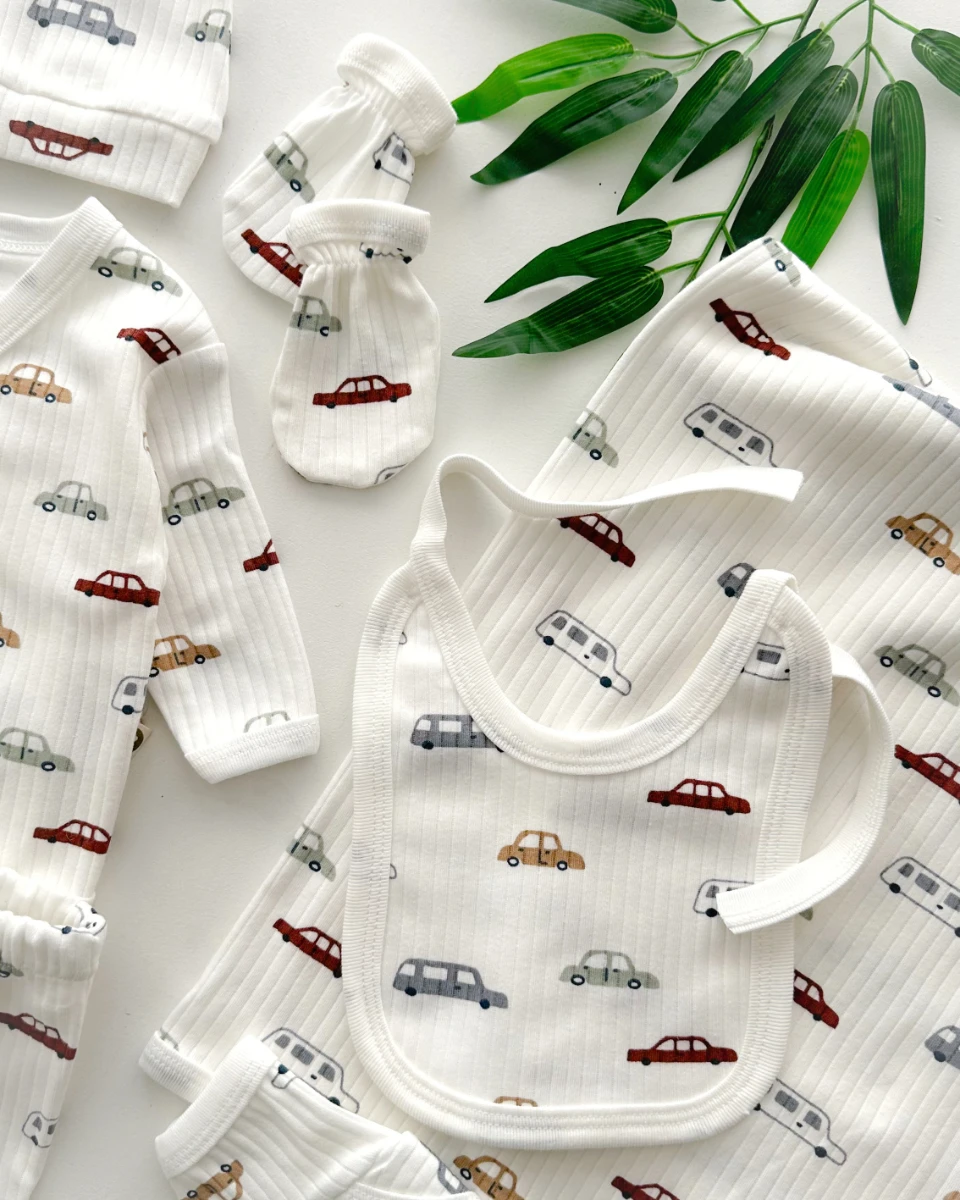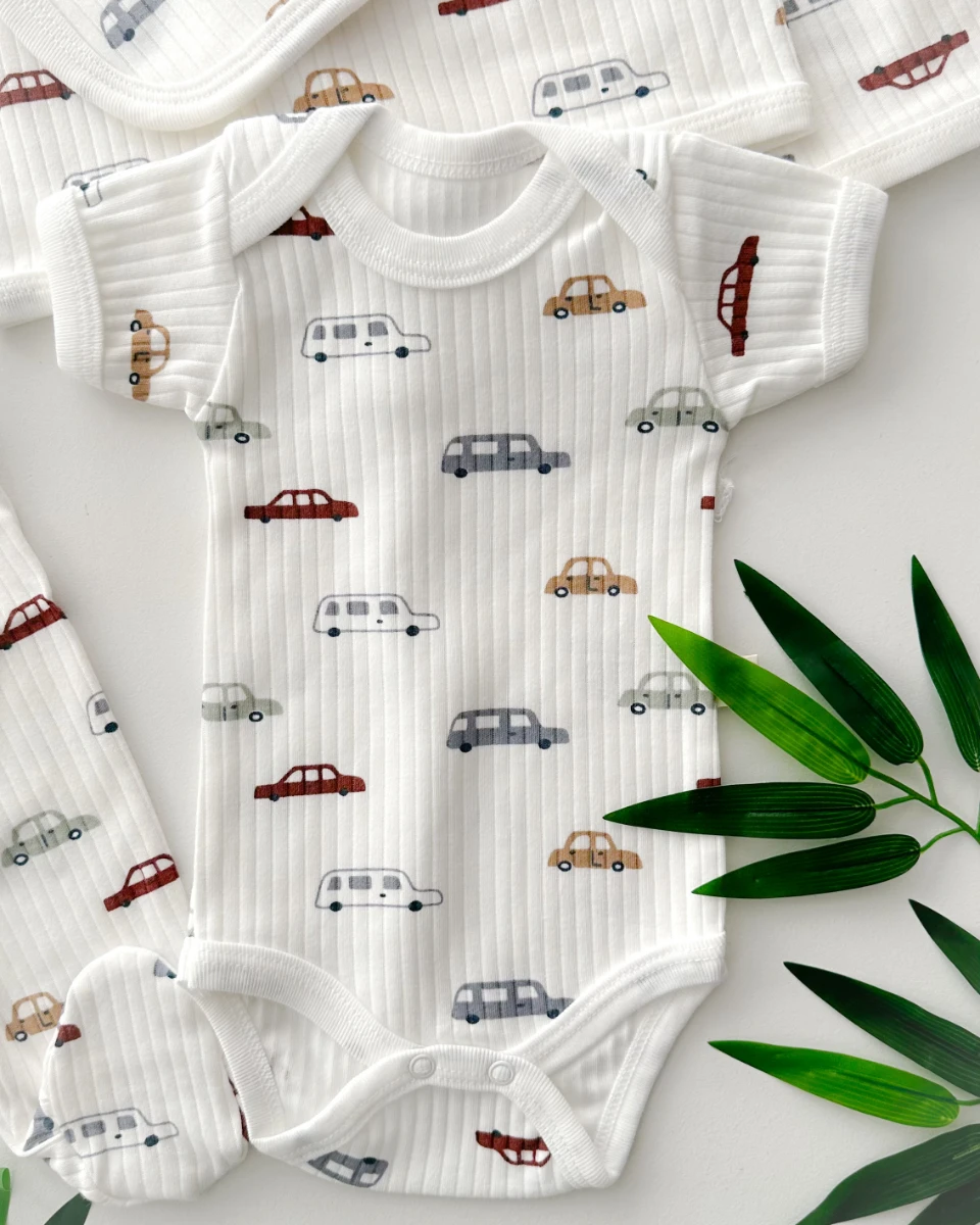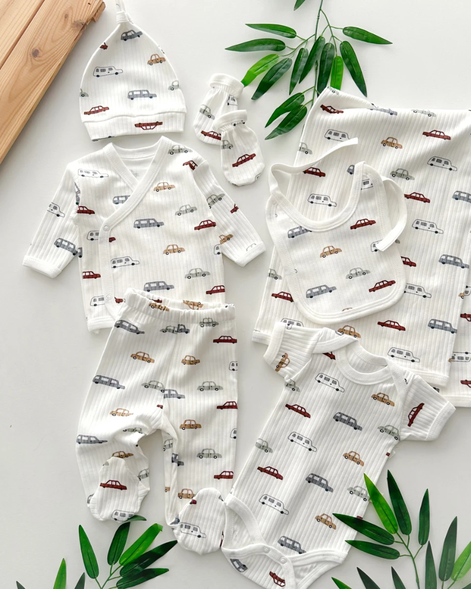 Büyük renkli arabalar yandan çıtçıtlı fitilli mevsimlik kumaş yenidoğan 7 parça set