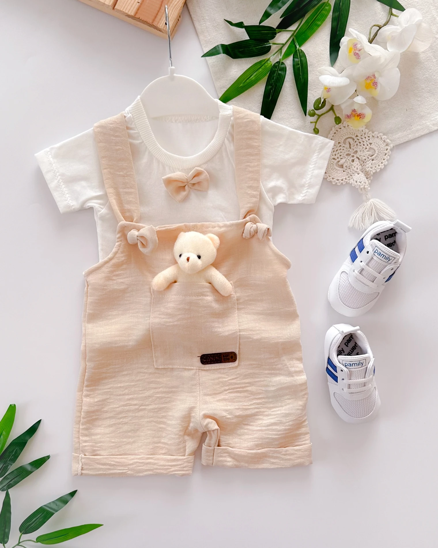 Çıkarılabilir oyuncak ayıcıklı papyonlu yazlık muslin 2li salopet set