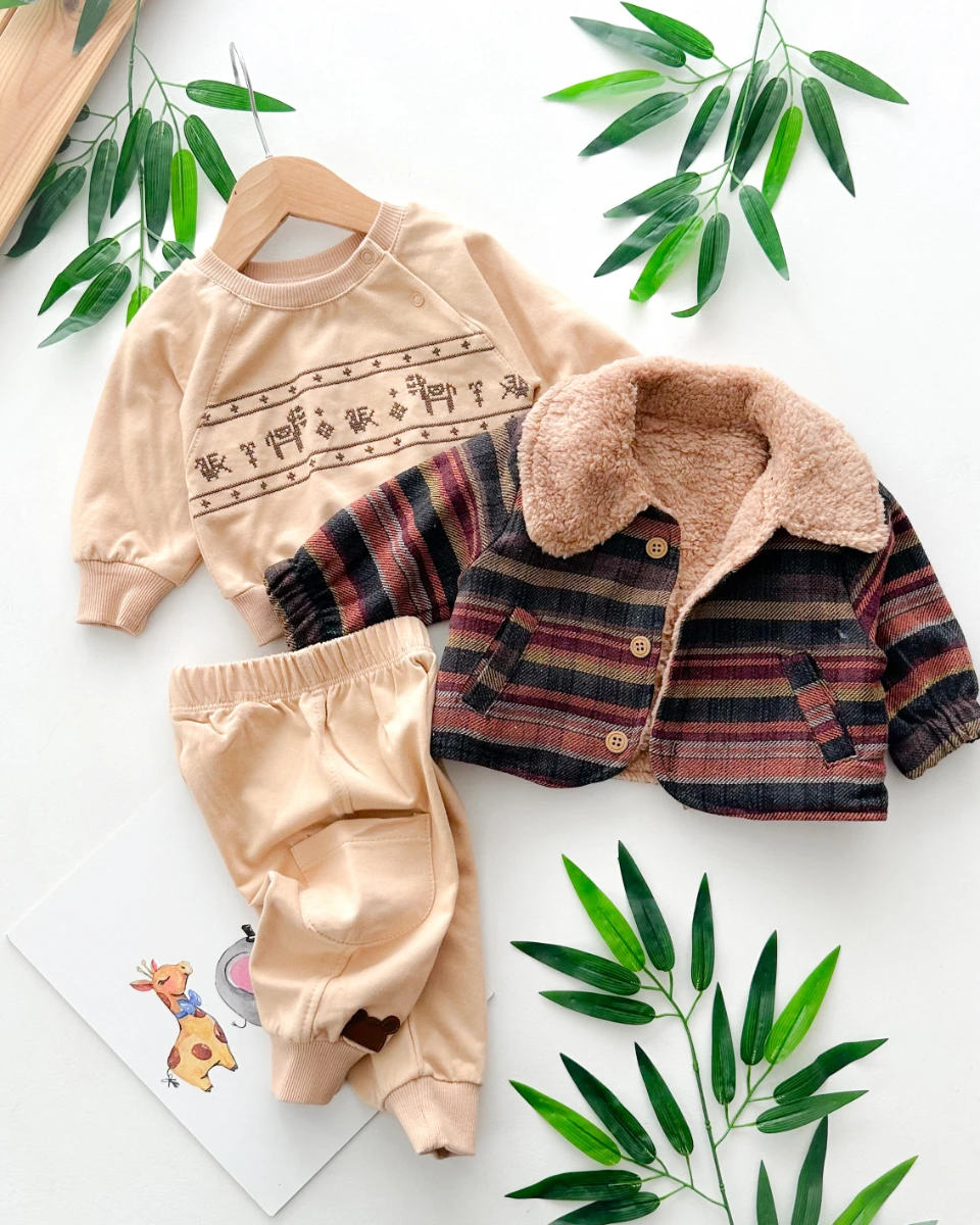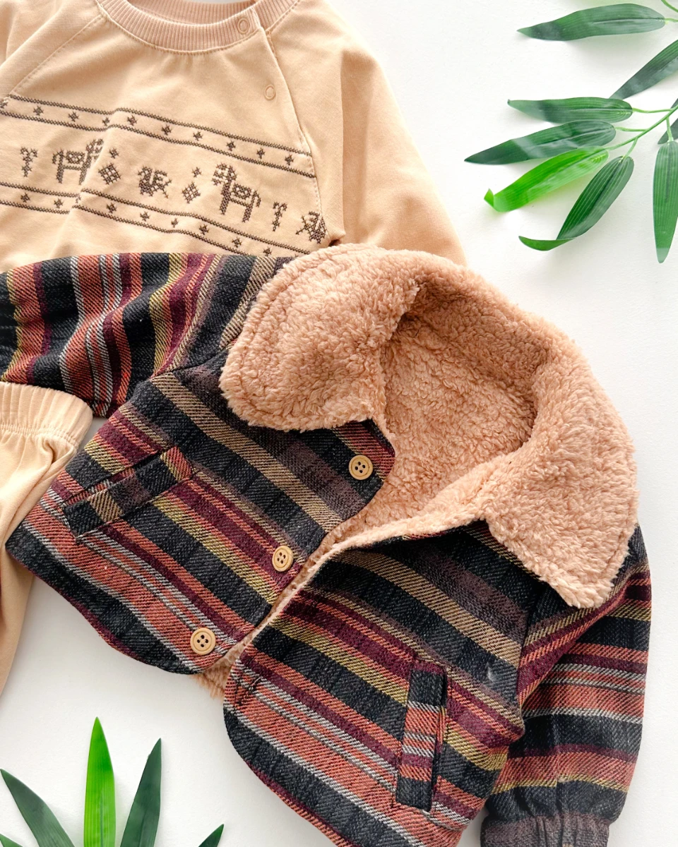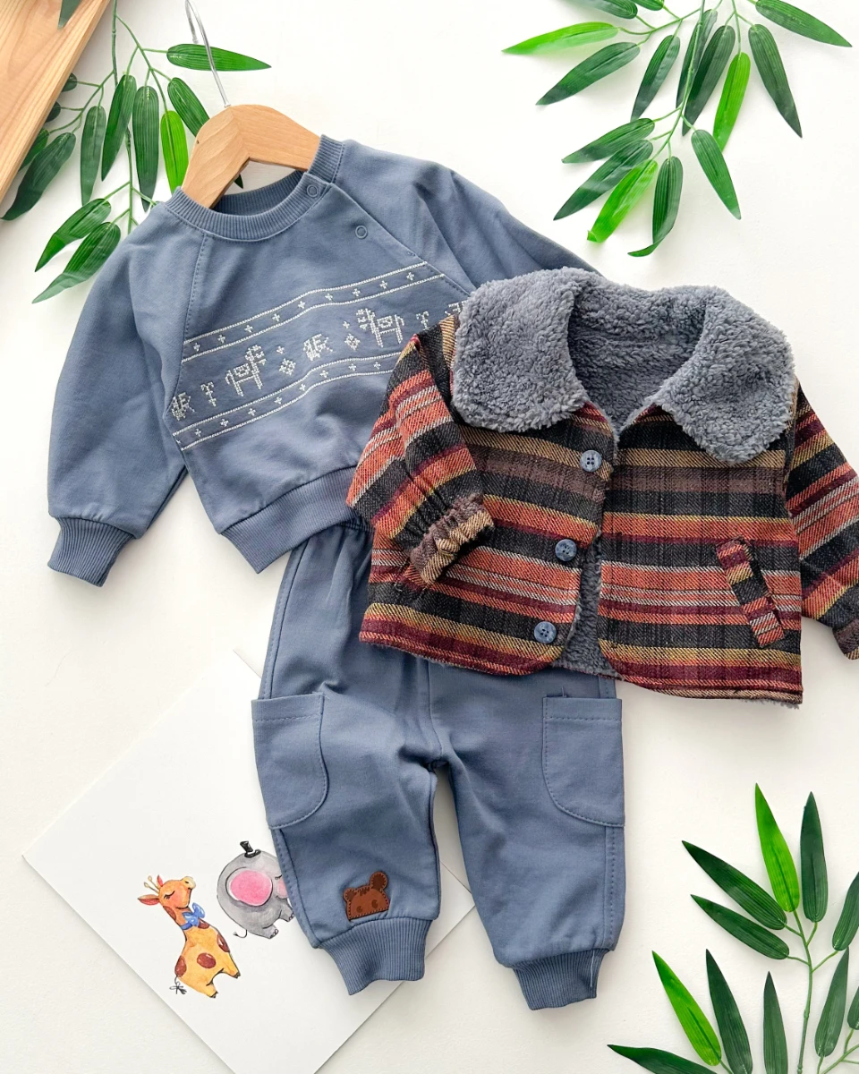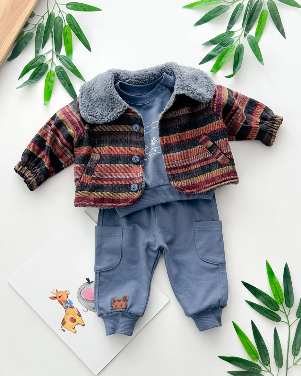 Ekose desen içi ve yakası kürklü montlu kışlık 3 parça takım