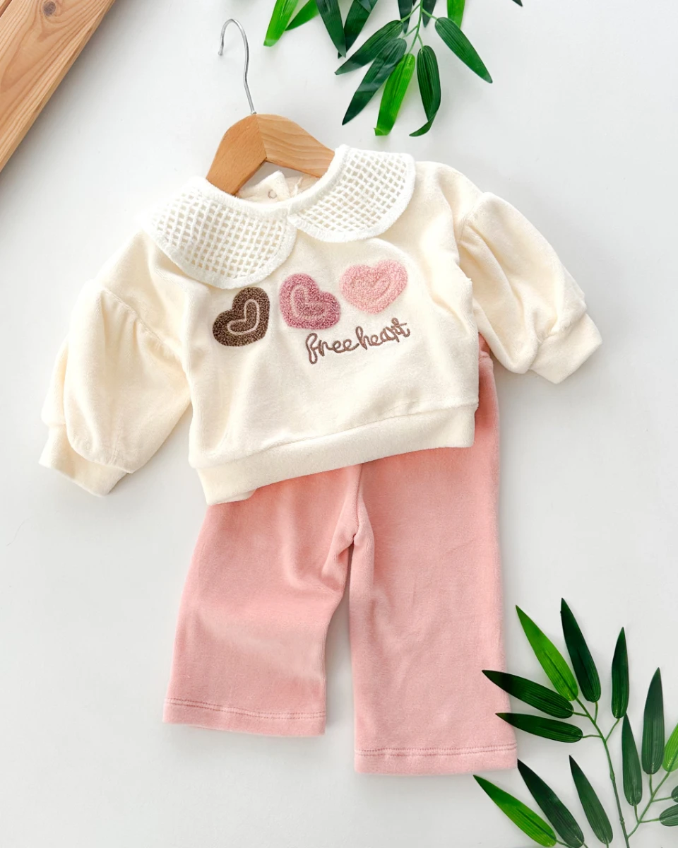 Free heart nakışlı file bebe yaka detaylı kadife kumaş kışlık 2 parça takım