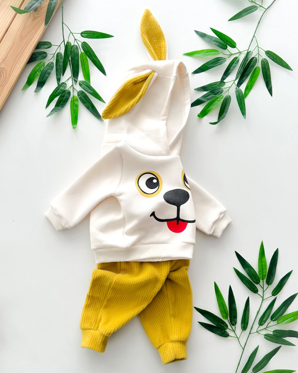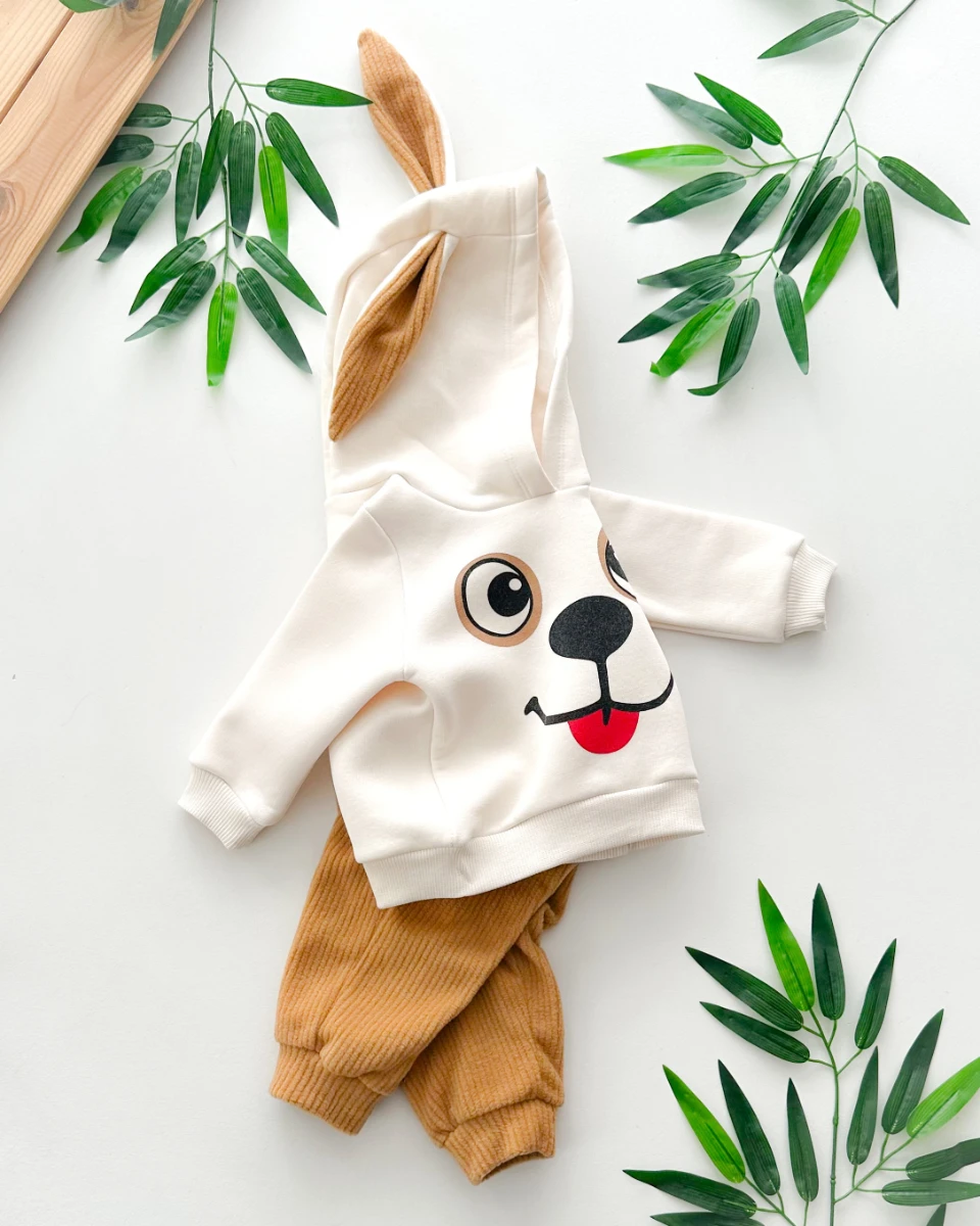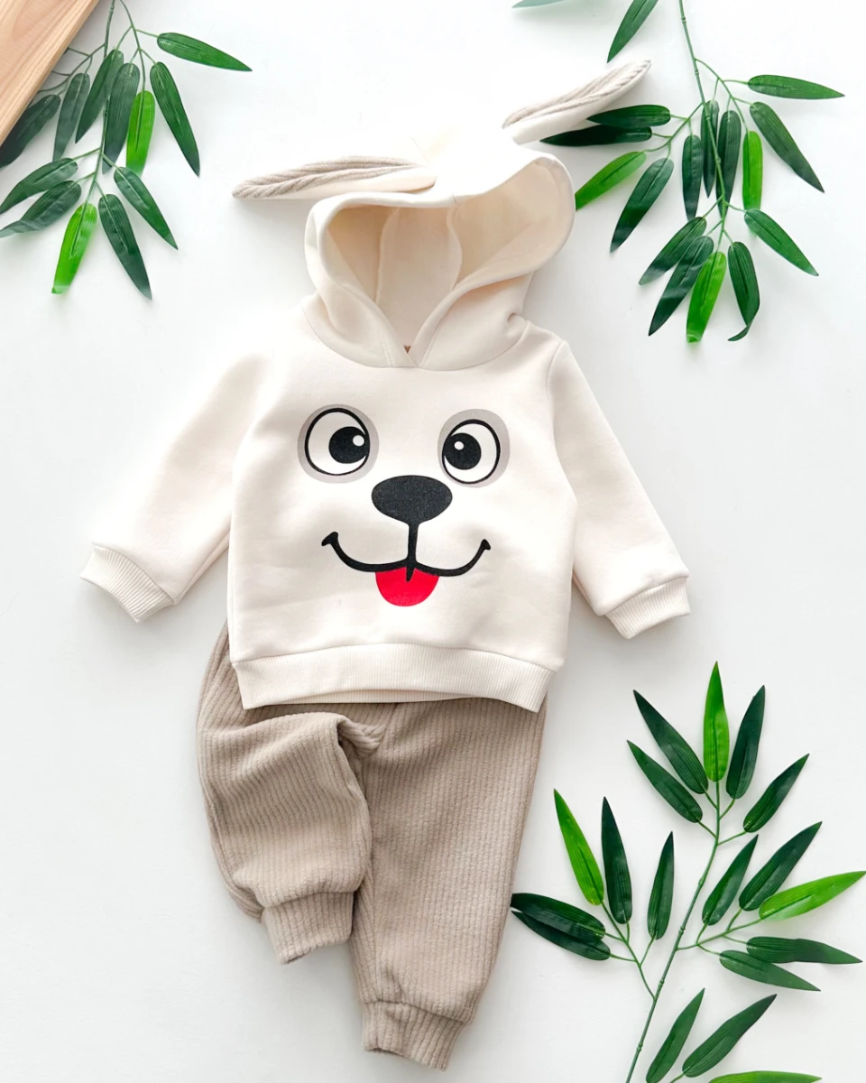 Gülümseyen köpekçik uzun kulaklı kapüşonlu kadife pantolonlu kışlık 2 parça takım