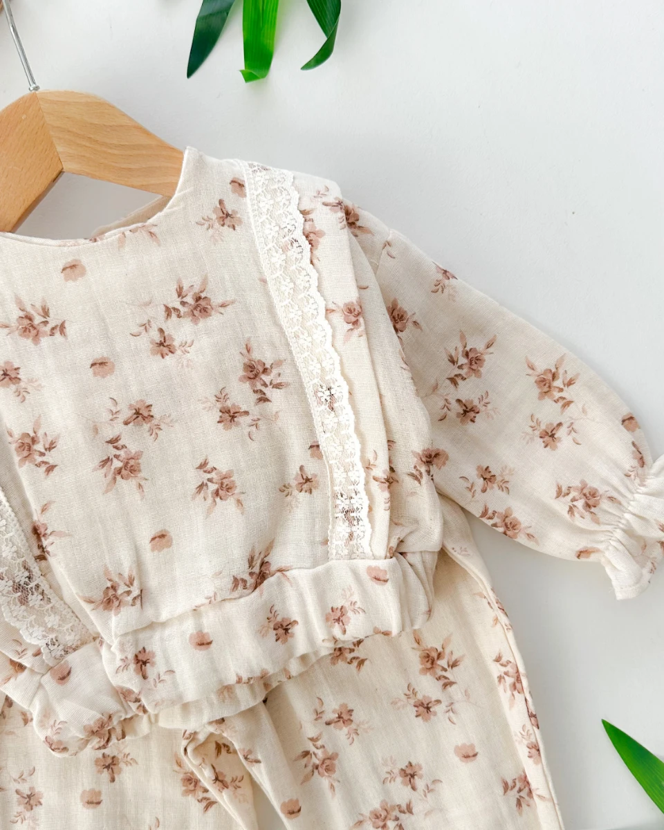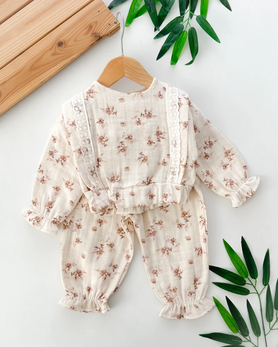 • İki yanda güpür şerit detaylı narin çiçekler baskılı paça ve kol büzgülü muslin 2 parça takım