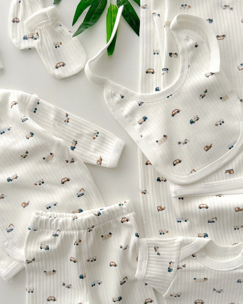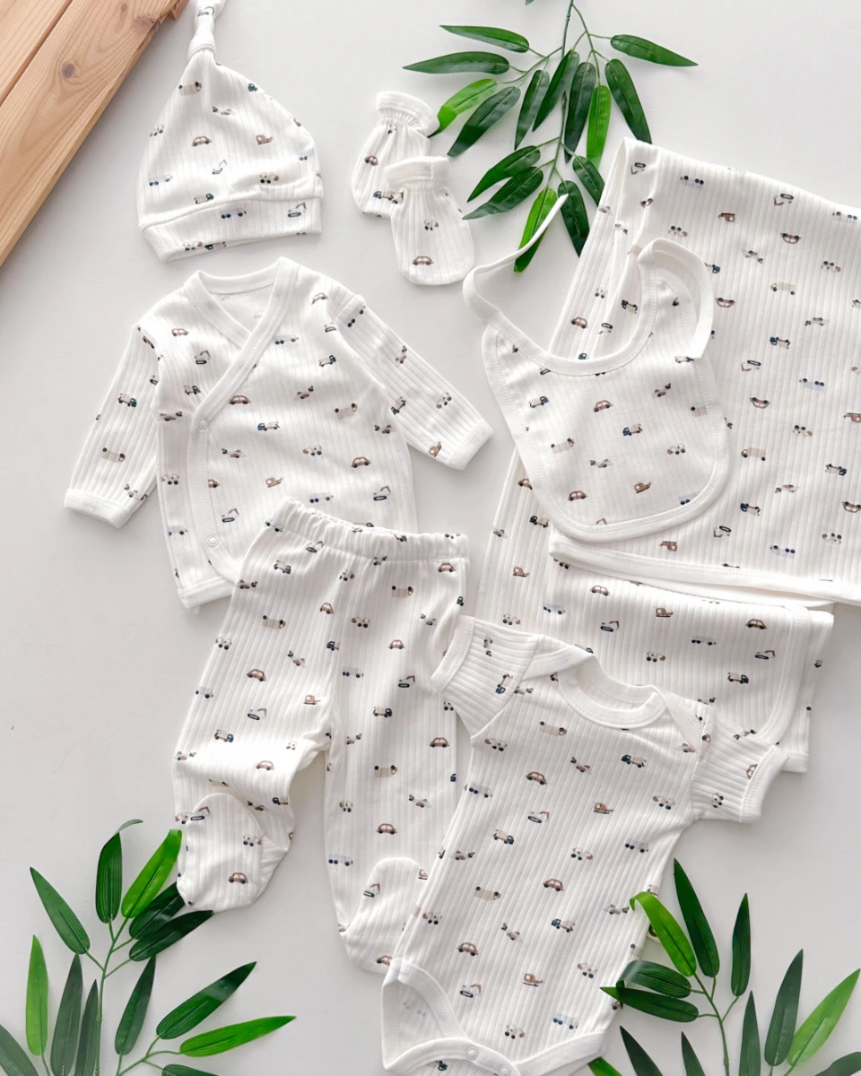 İş makineleri baskılı yandan çıtçıtlı fitilli mevsimlik kumaş yenidoğan 7 parça set