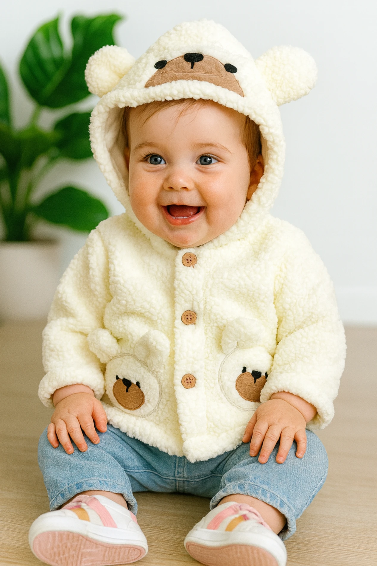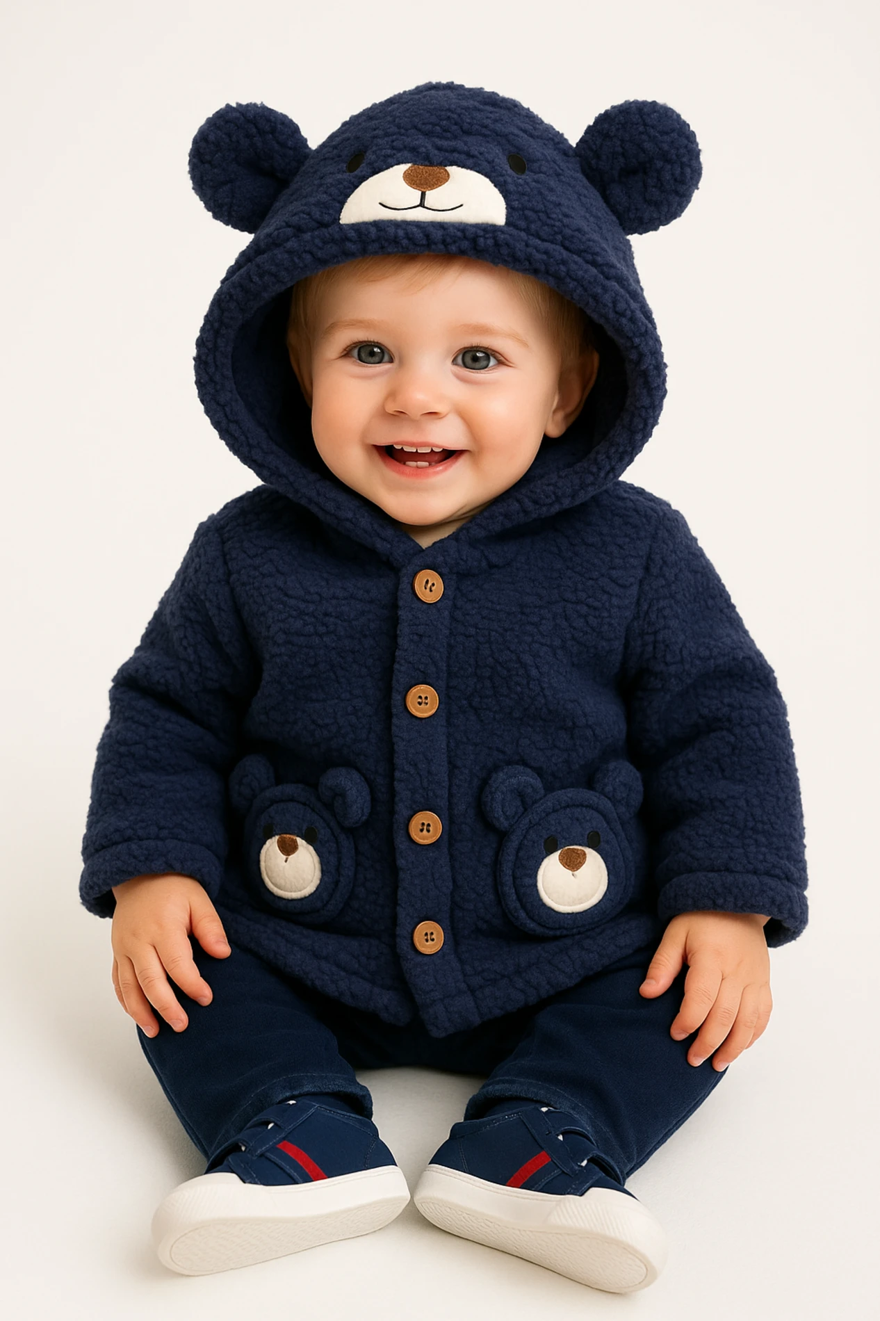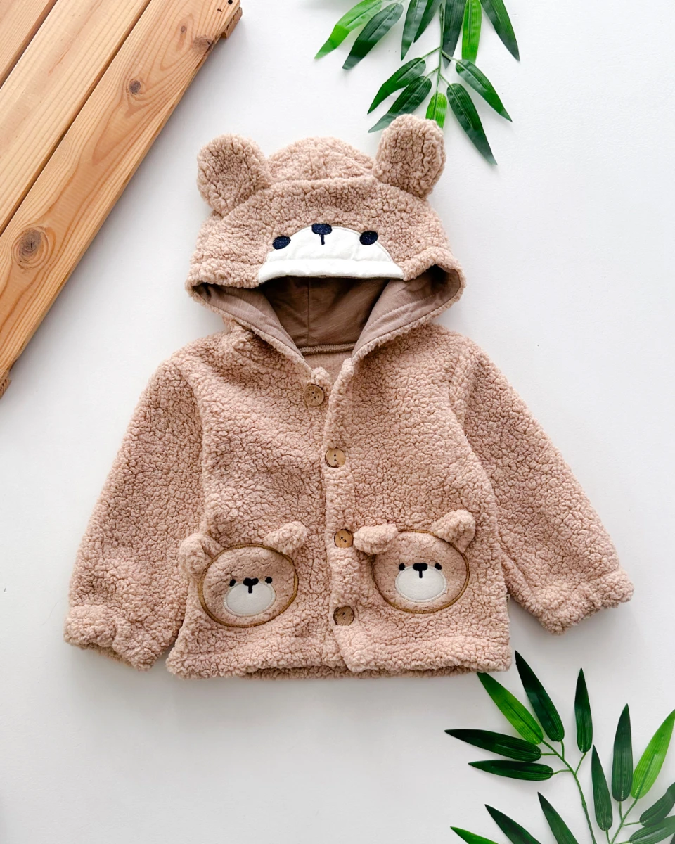 Kapüşon ve cepte bear suratlar detay önden düğme peluş hırka