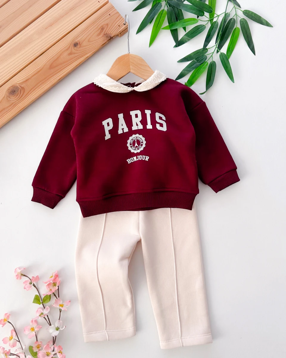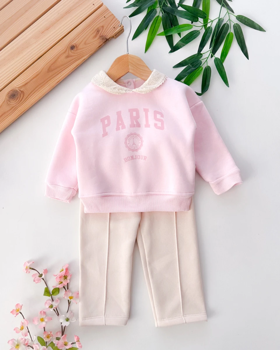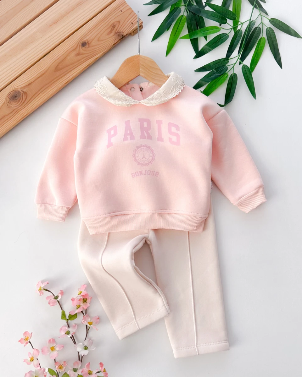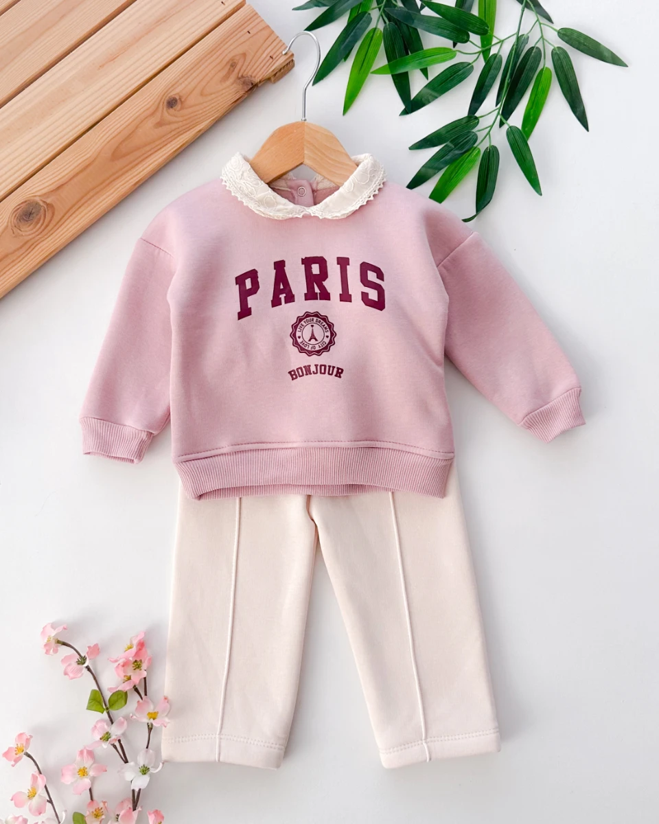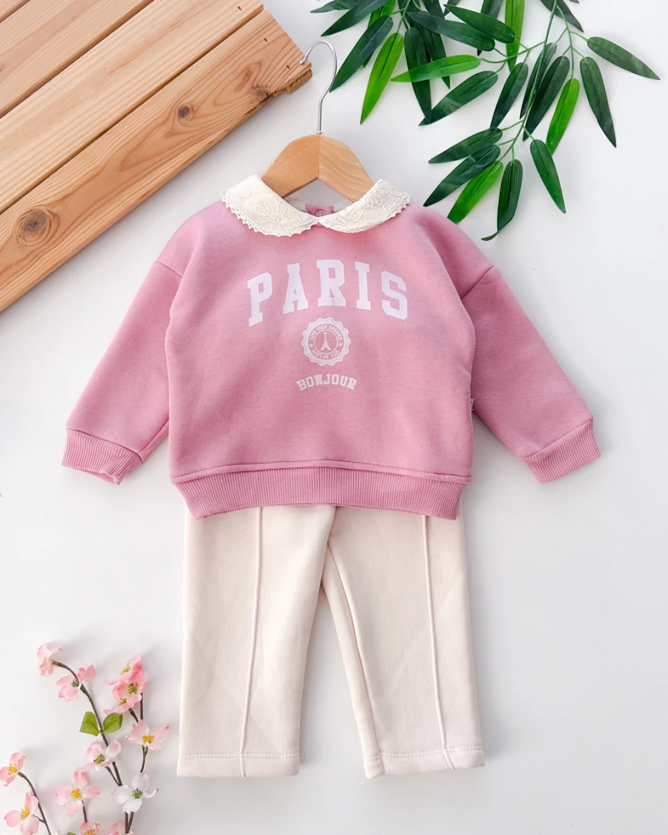 Paris bonjour baskılı yaka detaylı şardonlu kışlık 2 parça takım
