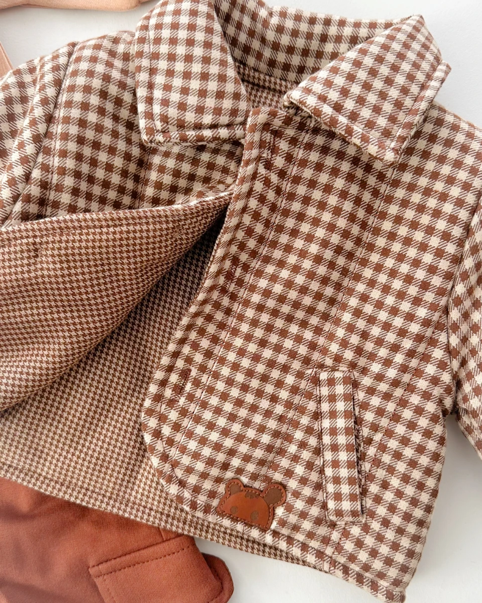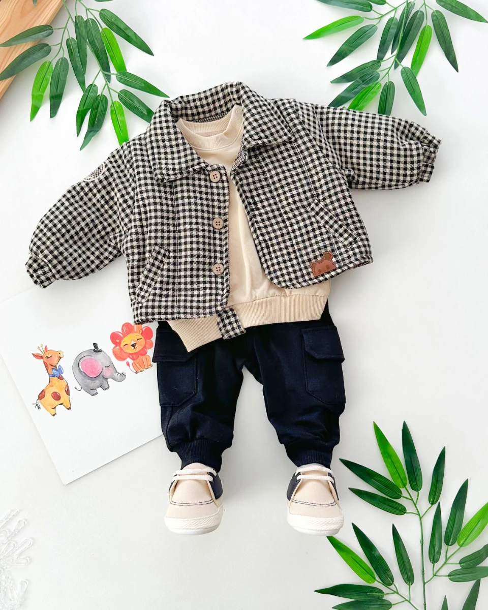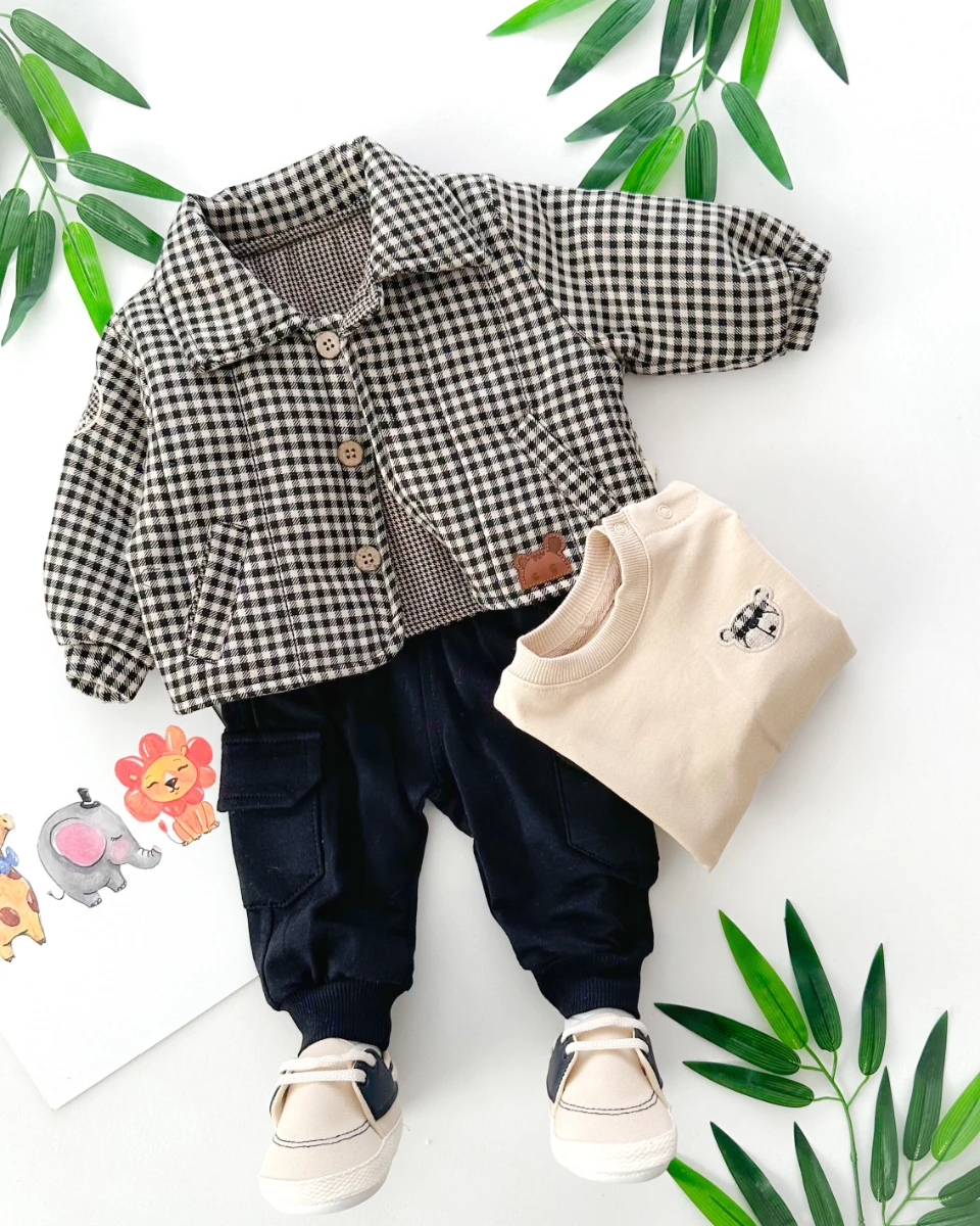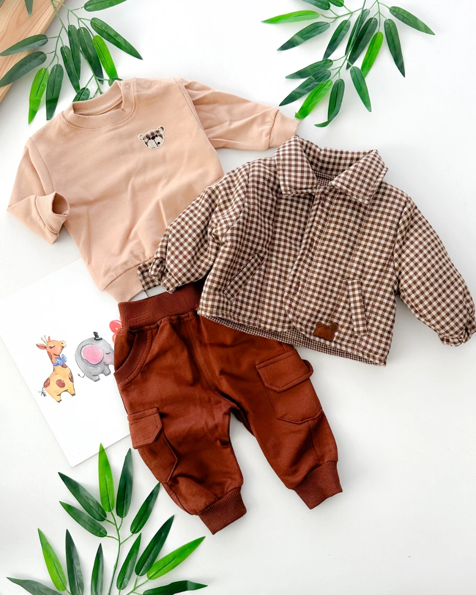 Pötikare desenli şirin ayı armalı ceketli kışlık 3 parça takım