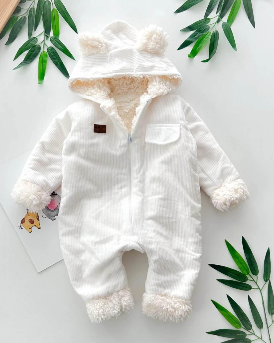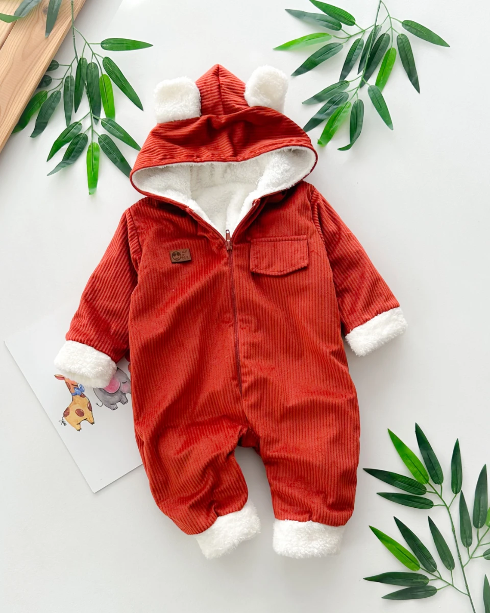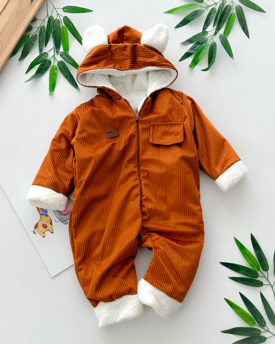 Sahte cep görünümlü dışı kadife içi kürklü kapüşonlu kışlık welsoft tulum