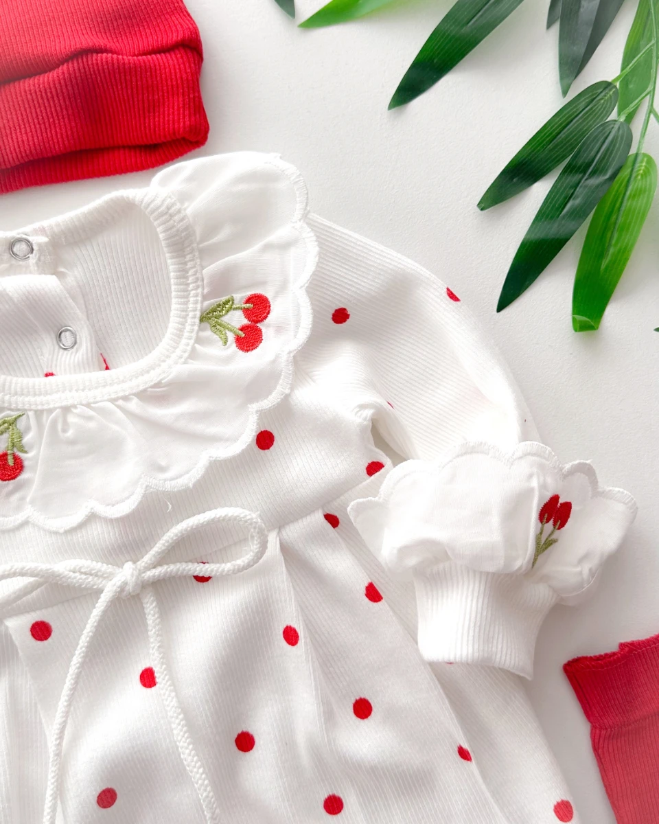Yakada ve kollarda kiraz nakışlı arkadan ve alttan çıtçıtlı mevsimlik 3 parça tulum set