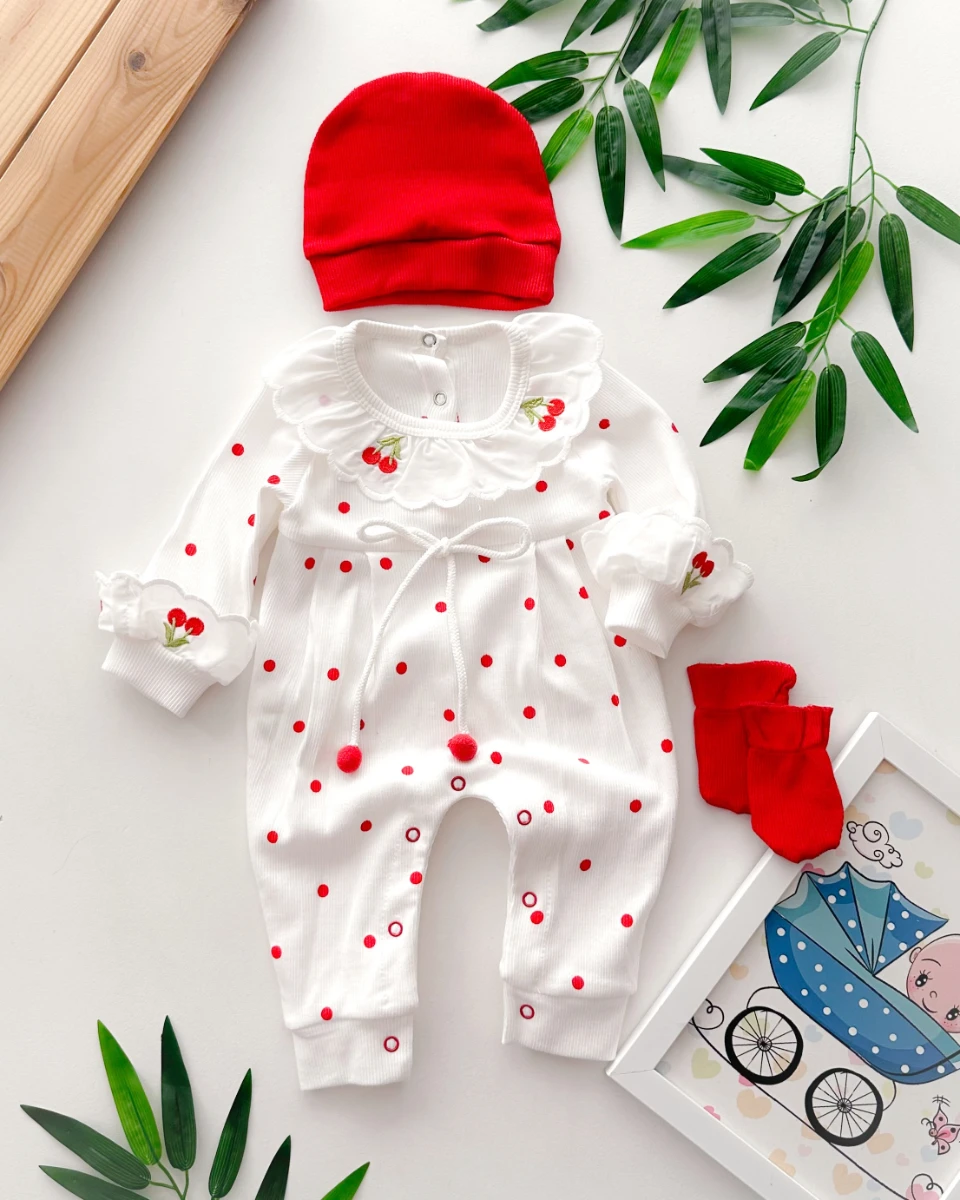 • Yakada ve kollarda kiraz nakışlı arkadan ve alttan çıtçıtlı mevsimlik 3 parça tulum set